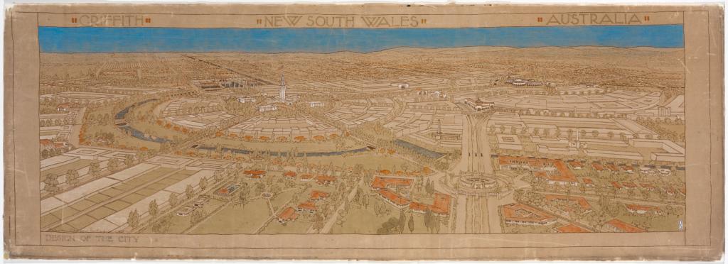 An artist's impression of Griffith and Leeton (along with plans, not shown here) was originally commissioned by the Department of Water Resources - Lands Administration Branch - Water Conservation and Irrigation Commission in 1913.
