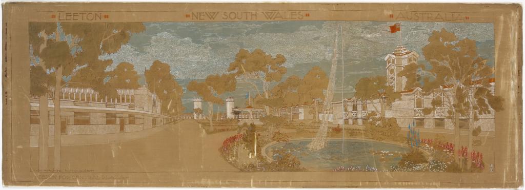 - The Silkscreen Plan of Leeton, 1913 [Document No 224] is a design for a central plaza and shows large buildings surrounding a spacious, beautiful garden area complete with trees and a fountain.
