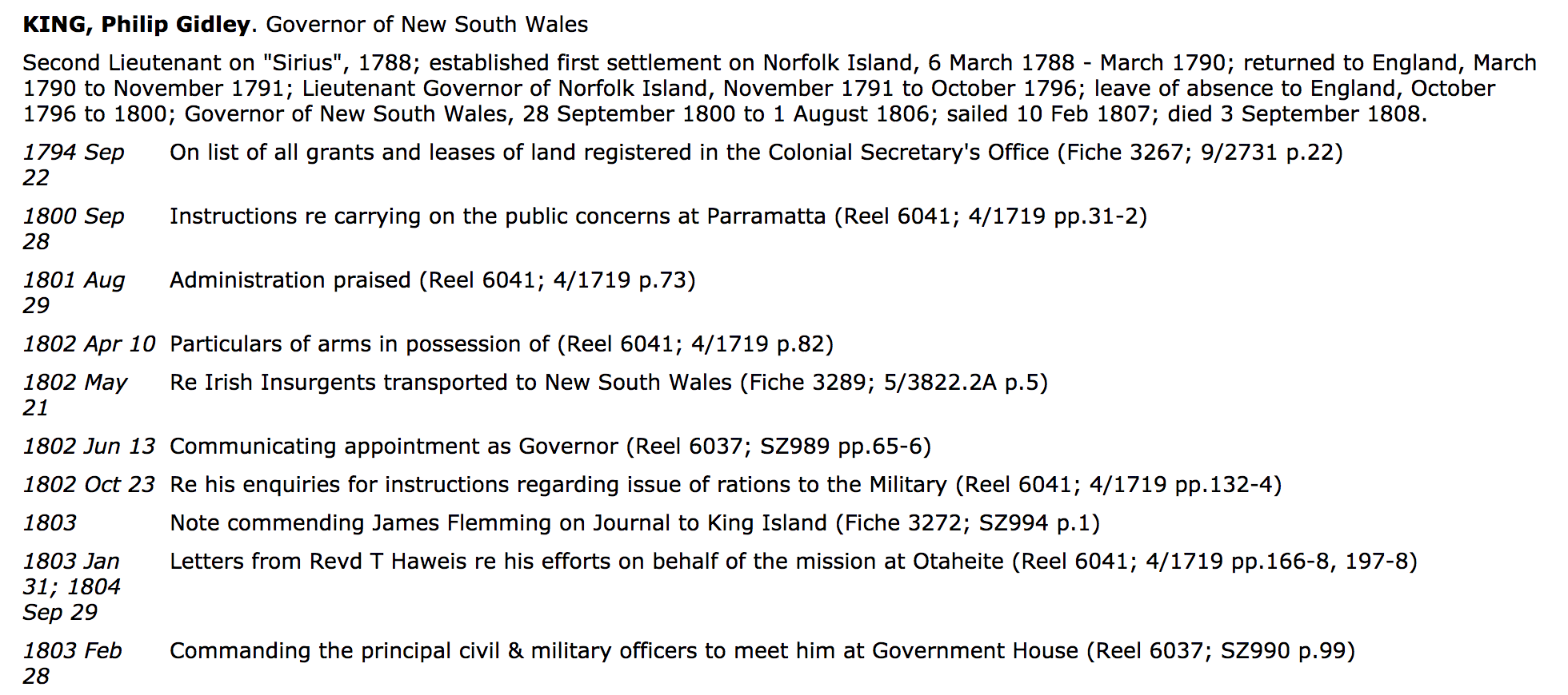 Source: Shaw, A.G.L. (1967). King, Phillip Gidley (1758-1808). Australian Dictionary of Biography, volume 2