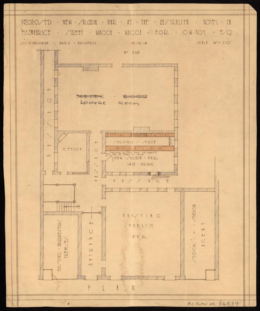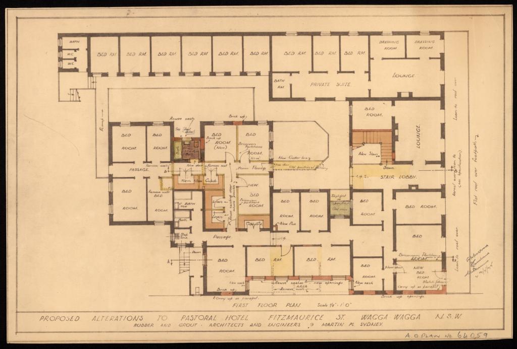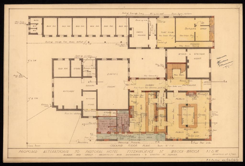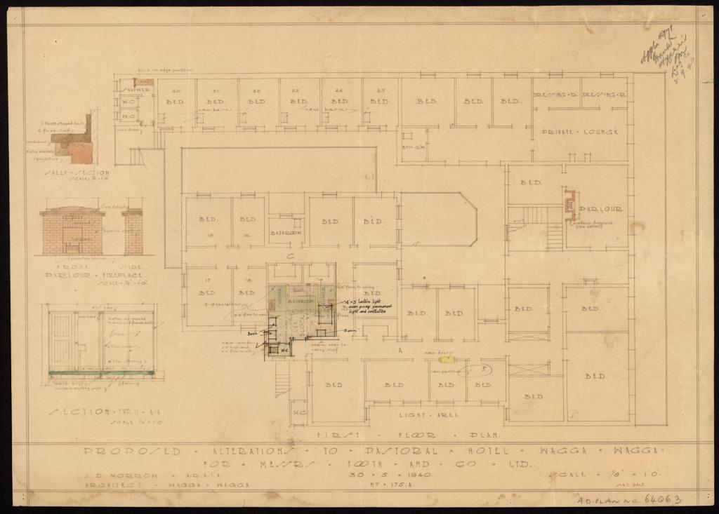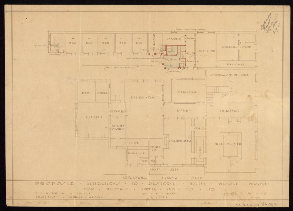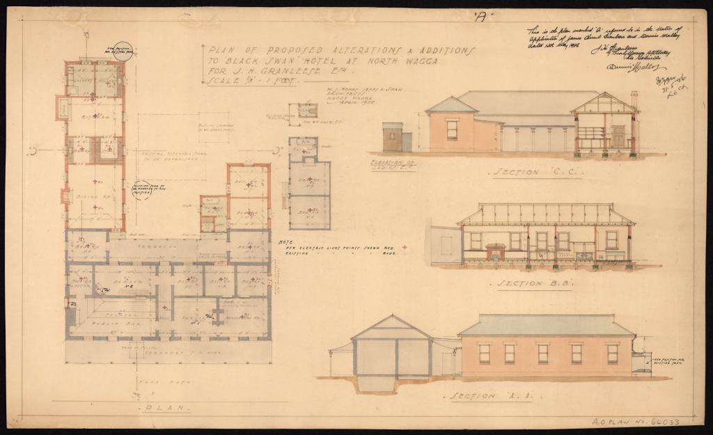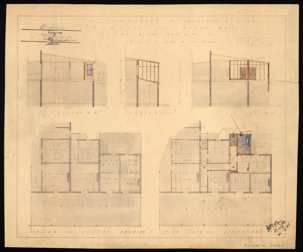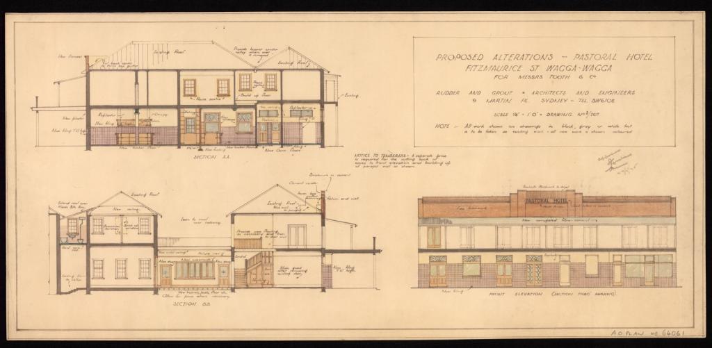 Plans for proposed hotels and for alterations and additions to existing hotels in Wagga and the surrounding area were submitted to the Licensing Court for approval. The plans include elevations, sections, and floor plans. Most plans include details of the name of the hotel, its location, name of the architects, type of plan, scale, and date. Hotels were meeting places and provided accommodation in town for workers, visitors, commercial travellers and pastoralists from the surrounding area.