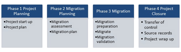 The Project Planning phase establishes responsibilities and sets out the scope of the project and its deliverables. The Migration Planning phase defines the processes to be undertaken in the Migration phase. The Project Closure phase closes the project and identifies any required post-project activities (such as the disposal of source records).