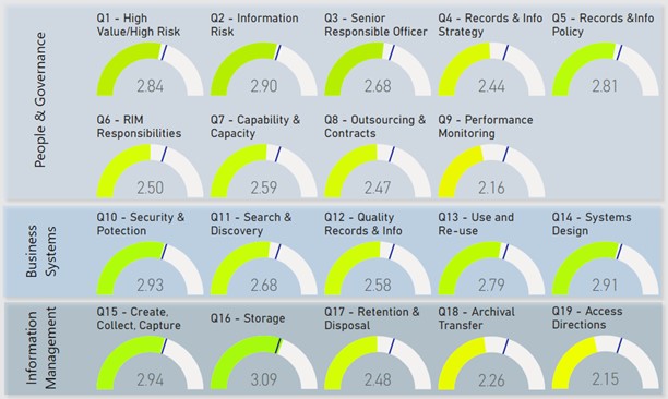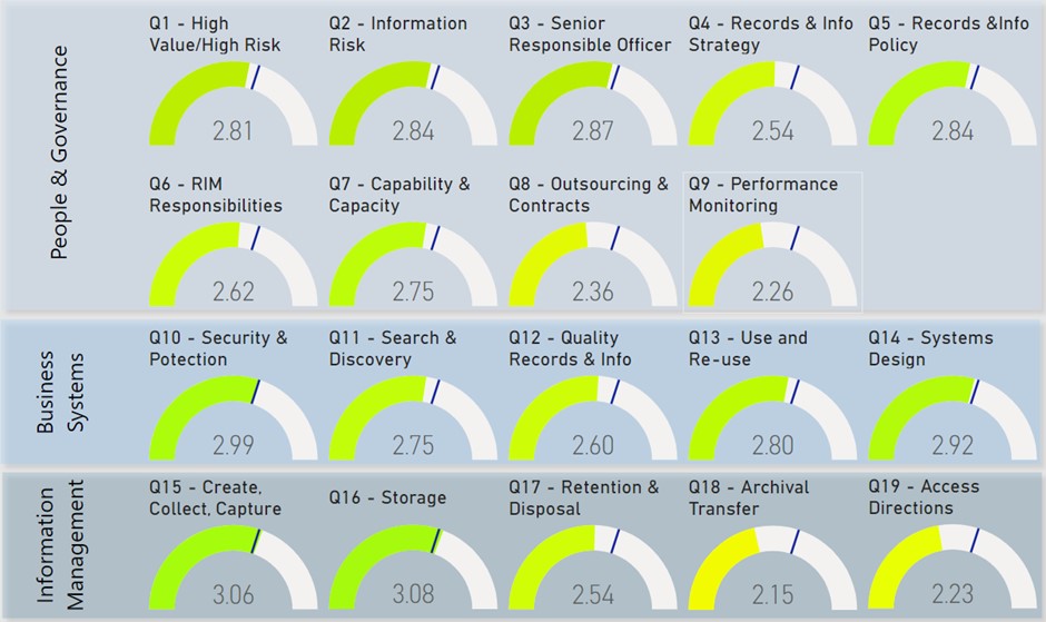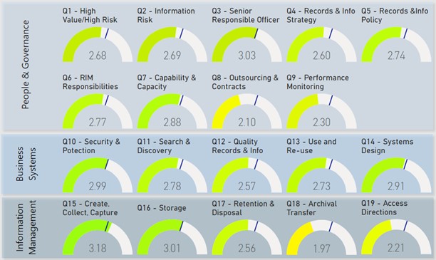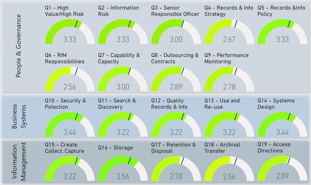 The average score for all but two RMAT questions is below the baseline compliance score of 3 (see Figure 1 below), however many are close to achieving the benchmark. This indicates recordkeeping maturity is generally ‘developing’ but some have managed to transition to ‘defined’.