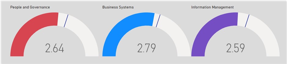 The RMAT is divided into three topic categories: People and Governance, Systems & Business, and Information Management. Looking at the scores for the 3 categories provides an insight at public office capability. Figure 2 shows the average total score for all public offices in each category.
