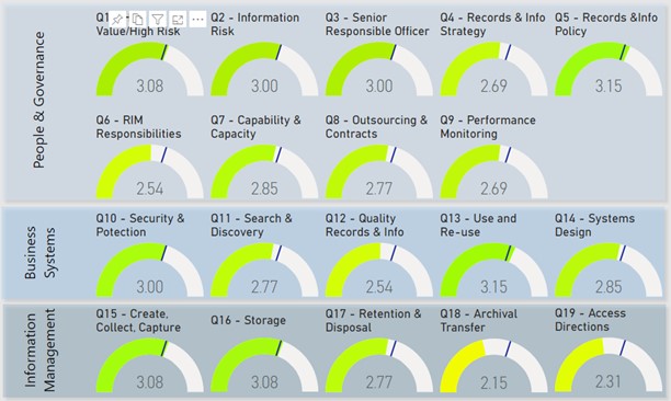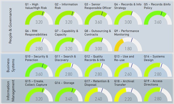 The People and Governance category includes Questions 1 – 9 of the RMAT. It explores whether public offices have put frameworks in place to manage records and information management. Including the identification and prioritisation of High risk/High Value records, managing information risks, records management governance (policy, strategic planning, responsibilities, capability and capacity to support records management), and monitoring of records and information management in the organisation.